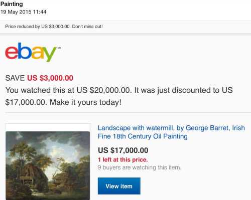 Ebay announcement: SAVE US $3,000.00 You watched this at US $20,000.00. It was just discounted to US $17,000.00. Make it yours today! Landscape with watermill, by George Barret, Irish Fine 18th Century Oil Painting: US $17,000.00: 1 left at this price. 9 buyers are watching this item. (22nd May 2015